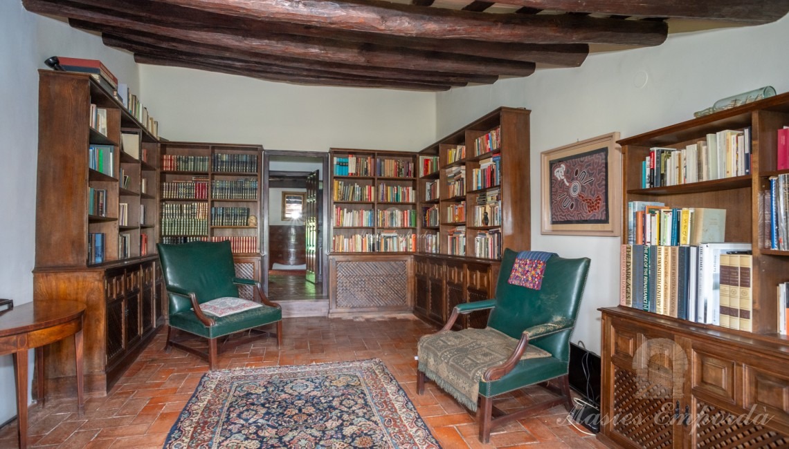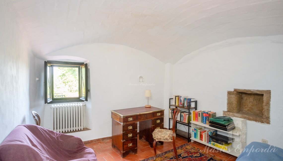 Second floor: Spacious and cozy main hall of the house with fireplace with exit to an arcade terrace overlooking the property and the region. In this floor there is also a double room with bathroom and a living room with fireplace from where you go directly to the garden. A double room with living room and a bathroom, a library.